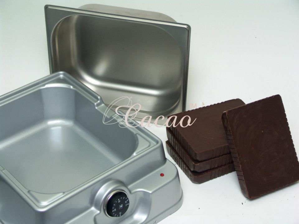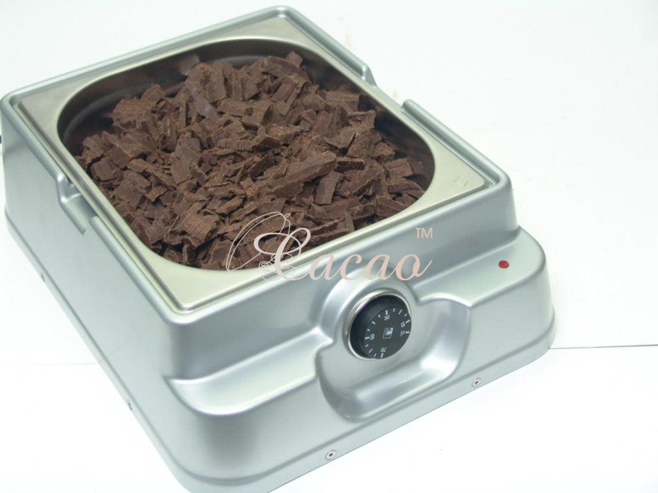 Cacao™ India Chocolate Melter ( No Water – Dry Heating) VOLTAGE: 240V FREQUENCY: 50-60HZ WATTAGE : 180 WATT MELTING PAN CAPACITY : 6 KG MAX TEMPERATURE: 70˚C POWER CONSUMPTION: 5 HORS RUNNING= 1 UNIT (APX.)